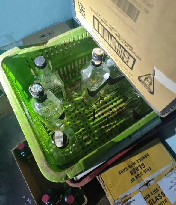Entre as garrafas cheias apreendidas, foram quatro de Royal Apple, cinco de Black Label, quatro de Gold Label, uma de Gold Label Reserve, uma de Johnnie Walker Black Blended Scotch, uma de Johnnie Walker Blonde, sete de Johnnie Walker Red Label, uma de Johnnie Walker Blend Gold Scotch, sete de White Horse 1L, uma de White Horse 600 ml, seis de Jack Daniel’s, sete de Buchanan’s Deluxe, duas de Royal Honey, duas de Chivas Regal, uma de Johnnie Walker Blend Scotch, uma de Ballantines Blend Scotch 12 anos, uma de Ballantines Finest, uma de Ballantines Bourbon, uma de Johnnie Walker Song of Ice e oito de Old Parr.