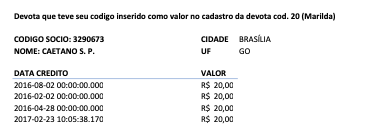 A defesa enviou ao Mais Goiás cinco planilhas para corroborar os seus argumentos: 1) o histórico de doações da devota Marilda O.M.S., cujo código é 20; 2) o histórico de Caetano S.P. (3290673); 3) o histórico de Maria I.S.M. (3437695); 4) o histórico de Silvio J.D.S (3358960); e 5) a relação de todas as doações oriundas da região de Anicuns (local onde teria sido feita matéria com um doador, morador da região, do grupo de carreiros, que teria tido seus dados erroneamente migrados).