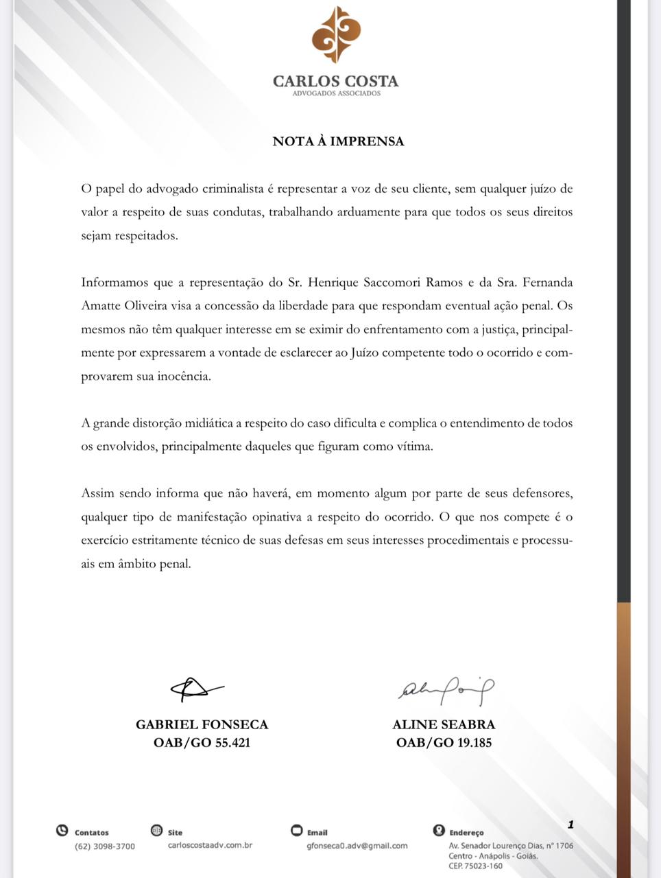 O Mais Goiás tentou contato com a defesa de Henrique para comentar o relatado, mas não teve retorno. O portal, contudo, teve acesso a um documento (enviado pelo escritório anterior) dos novos defensores – Gabriel Fonseca e Aline Seabra – no qual eles dizem que não farão manifestações opinativas a respeito do ocorrido. “O que nos compete é o exercício estritamente técnico.”