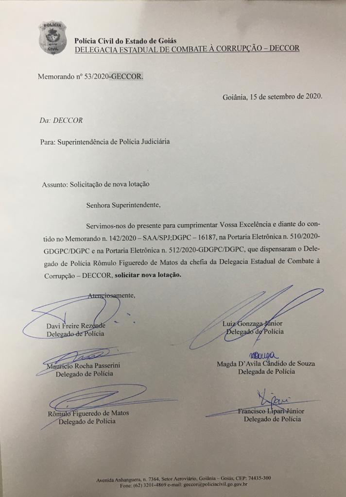 Constam no documento as assinaturas dos delegados Davi Freire Rezende, Luiz Gonzaga Júnior, Maurício Rocha Passerini, Magda D’Ávila Cândido de Souza, Francisco Lipari Júnior e Rômulo Figueiredo de Matos. Como dito, a decisão foi motivada por portaria da DGPC que dispensou o delegado Rômulo da chefia daquela delegacia.