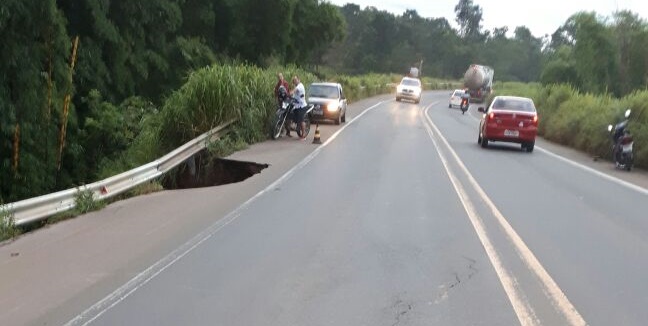 Além do buraco no acostamento, o asfalto da rodovia também apresenta rachaduras (foto), que indicam a instabilidade do solo. De acordo com o inspetor Jander Costa, o desmoronamento ocorreu em uma parte aterrada da rodovia. “Nas imagens, parece pequeno, mas lá o solo não é natural, é um aterro. Com o passar dos anos, teve manutenções, mas na época de chuva sempre há um desmoronamento. Nossa equipe avaliou este como um caso sério e optou por ser prudente, interditando até uma avaliação do Dnit, já que o peso dos veículos que trafegam por lá podem causar mais complicações”, observa.