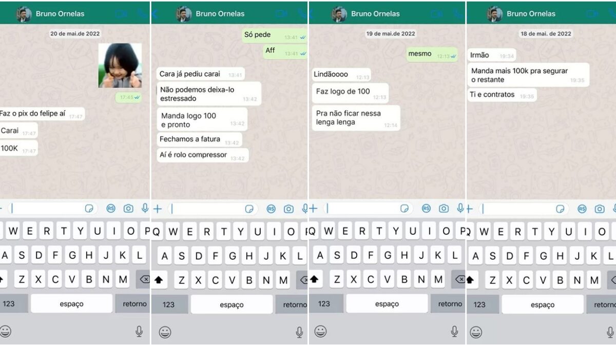 “Faz o pix aí”; “Lindão, faz logo de 100”; “Manda mais 100k”; “Lindão, só trabalho com comprovante”; “Ou tem capim ou não tem”; “Irmão, 17 horas é o prazo final pra TED”; “Manda os 100 que garanto irmão”, diz a conversa.