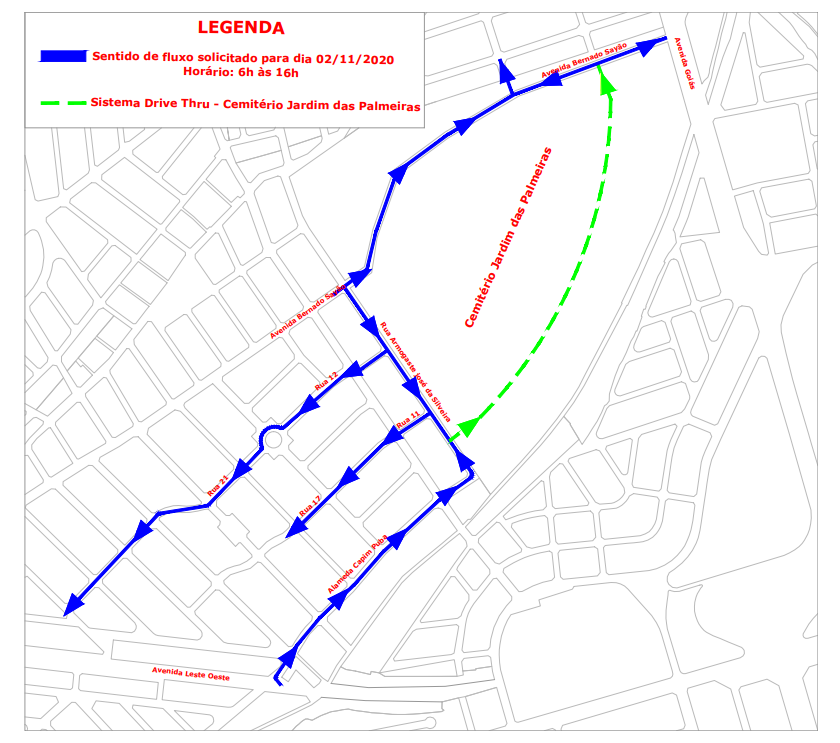 Conforme expôs a pasta, a Rua Armogaste José da Silveira, no Setor Centro Oeste, onde fica o cemitério Jardim das Palmeiras, terá sentido único: da Avenida Bernardo Sayão até a entrada do cemitério. A SMT informou que o motorista que chega ao Jardim das Palmeiras pela Alameda Capim Puba poderá circular até a entrada principal.