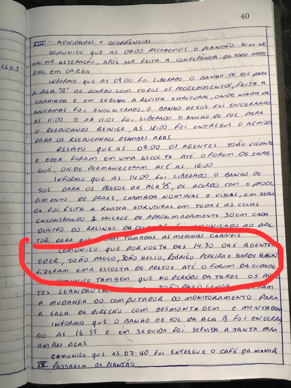Apesar disso, alguns registros foram feitos. O Mais Goiás teve acesso a imagens do livro ata que mostra que os funcionários João Hélio e João Paulo foram escalados para realizar a escolta de presos até o fórum da cidade. Nenhum dos dois consta na folha de pagamento da DGAP, de acordo com o Portal da Transparência.