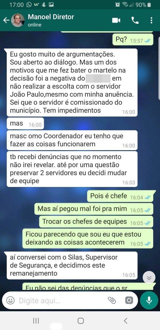 A denúncia aponta que um servidor efetivo da DGAP foi transferido de unidade porque discordou das decisões de Manoel. Em uma conversa por aplicativo de mensagens, o diretor afirmou que tinha conhecimento das irregularidades, mas que precisava “fazer as coisas funcionarem”. Ele afirmou. também. ter recebido denúncias contra o agente.