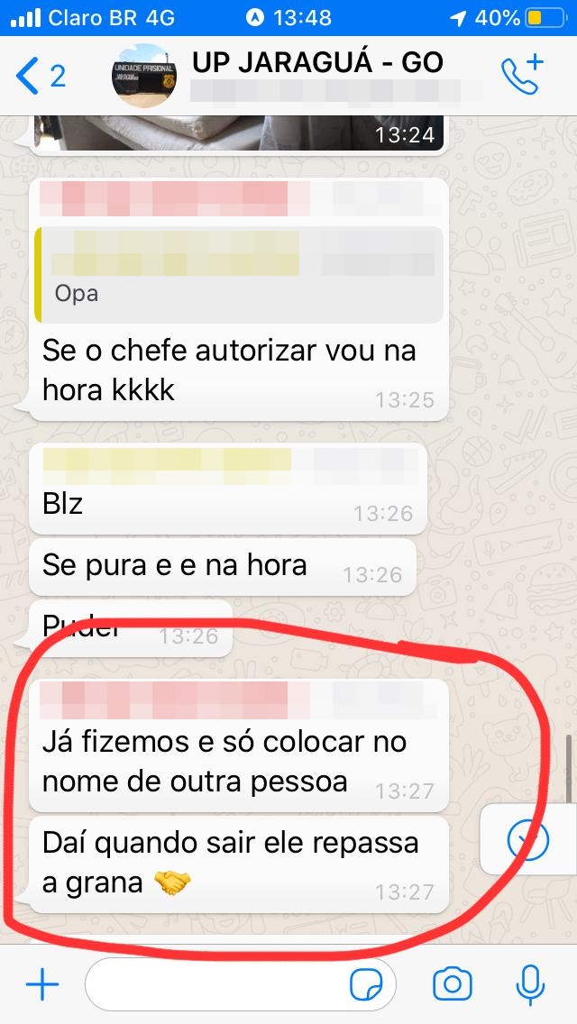 Uma troca de mensagens de um grupo da UP mostra que essa era uma prática comum e conhecida entre os funcionários. Em um momento da conversa, um servidor avisa que precisa de alguém para realizar uma atividade de monitoramento. Em seguida, outro fala: “já fizemos e [sic] só colocar no nome de outra pessoa. Daí quando sair ele repassa a grana”.