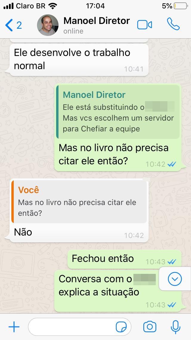 Para que as irregularidades continuassem acontecendo, os agentes eram orientados a ocultar os registros das funções exercidas pelos funcionários que estão cedidos da Prefeitura. Uma troca de mensagens mostra o Manoel dando essa orientação.