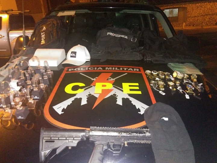 Com eles, os policiais encontraram relógios, coletes dos seguranças do centro de compras e um simulacro de arma longa usada para praticar o crime