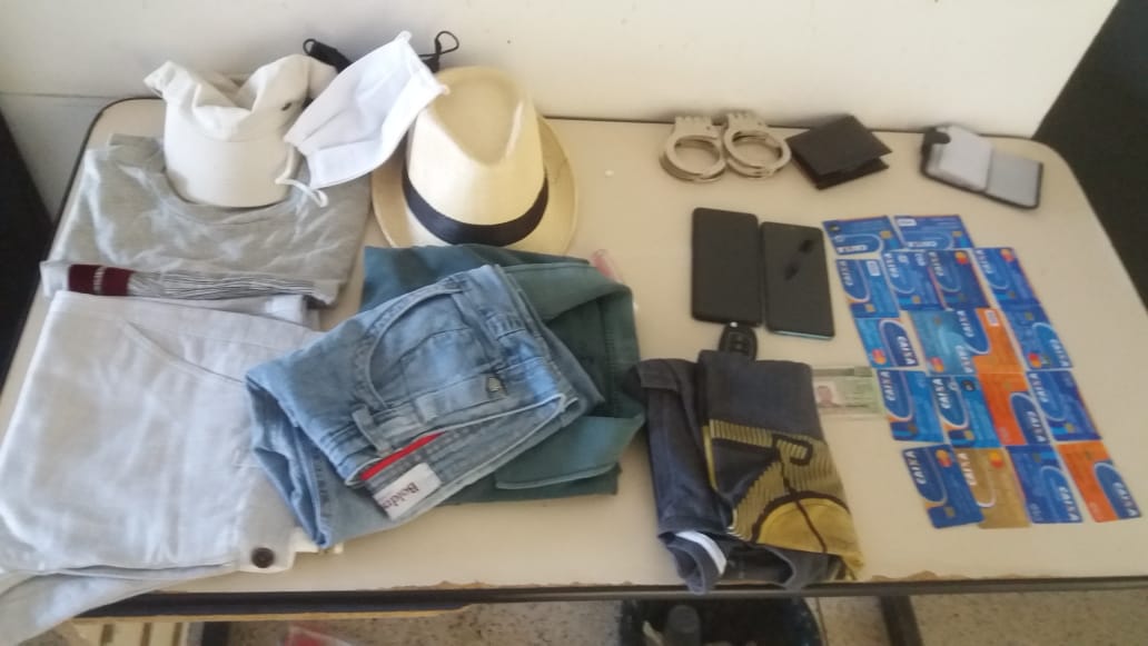 Com eles, os policiais encontraram e apreenderam cartões bancários em nome de várias pessoas.