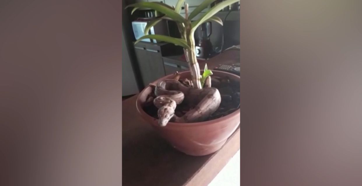 No vídeo, gravado por Eliete, é possível ver a preocupação da dona de casa: “A cobra está aqui dentro do meu vaso de orquídea”.