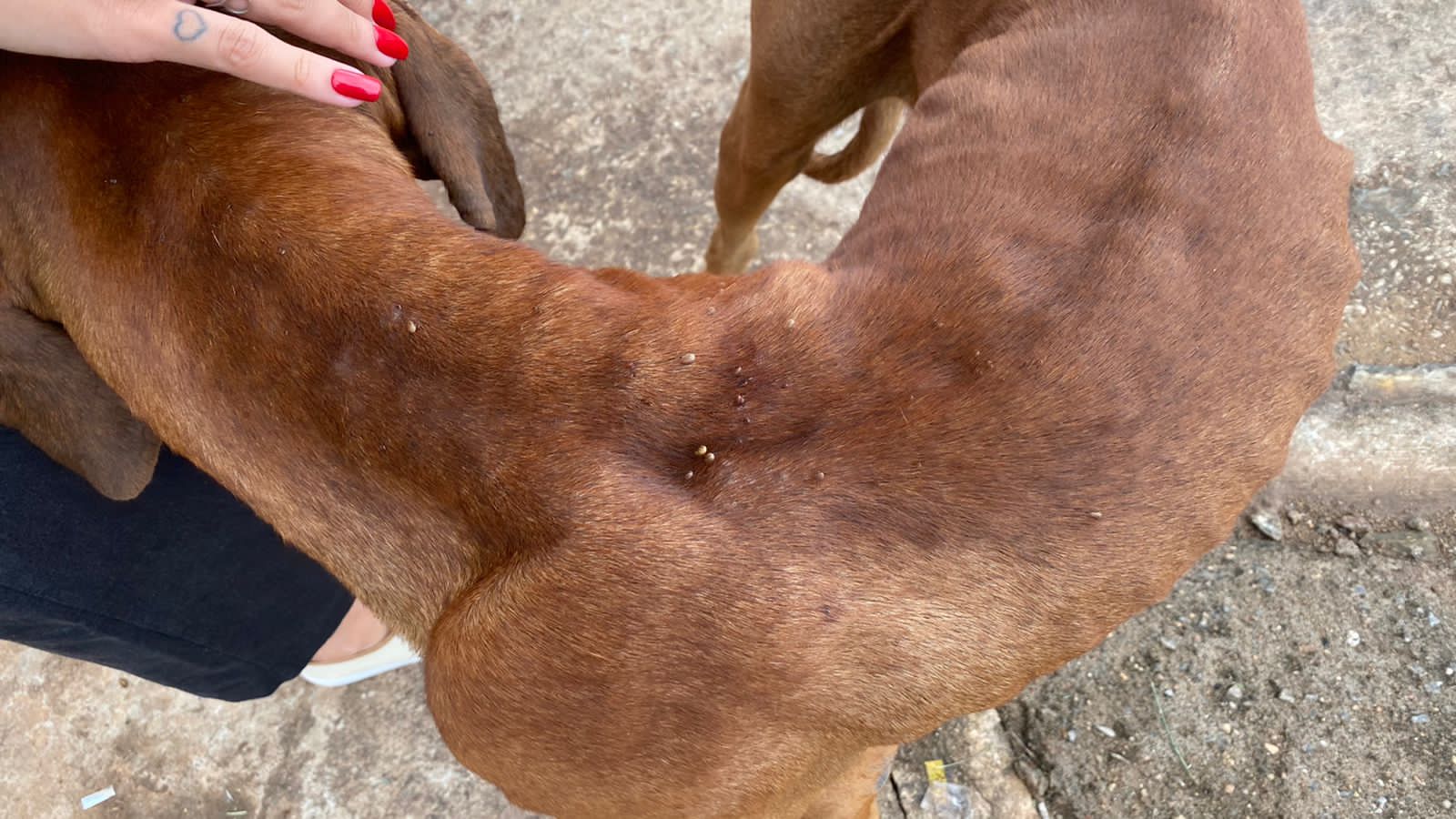 Cachorro estava preso em correntes com sinais de desidratação e infestado de carrapatos