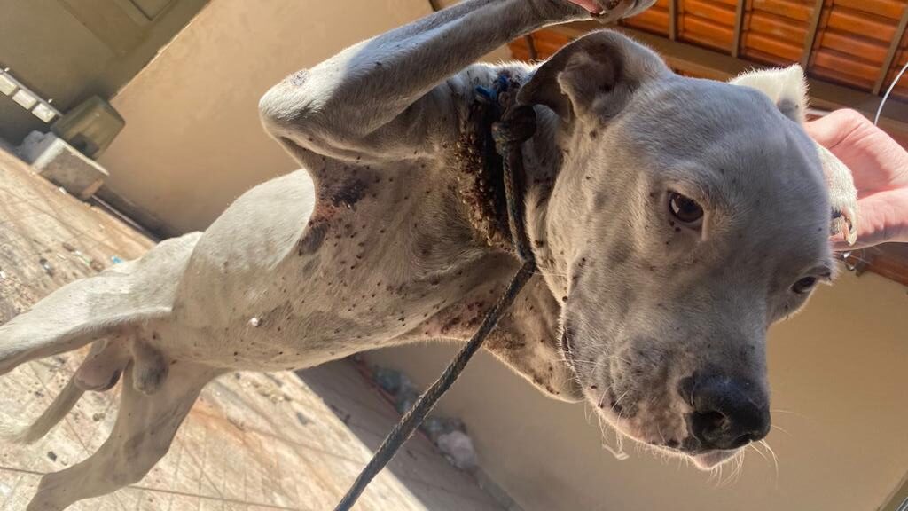 Animal foi encontrado debilitado, magro, com a gengiva branca, infestado de carrapatos e sinais de anemia em uma casa do Jardim Europa