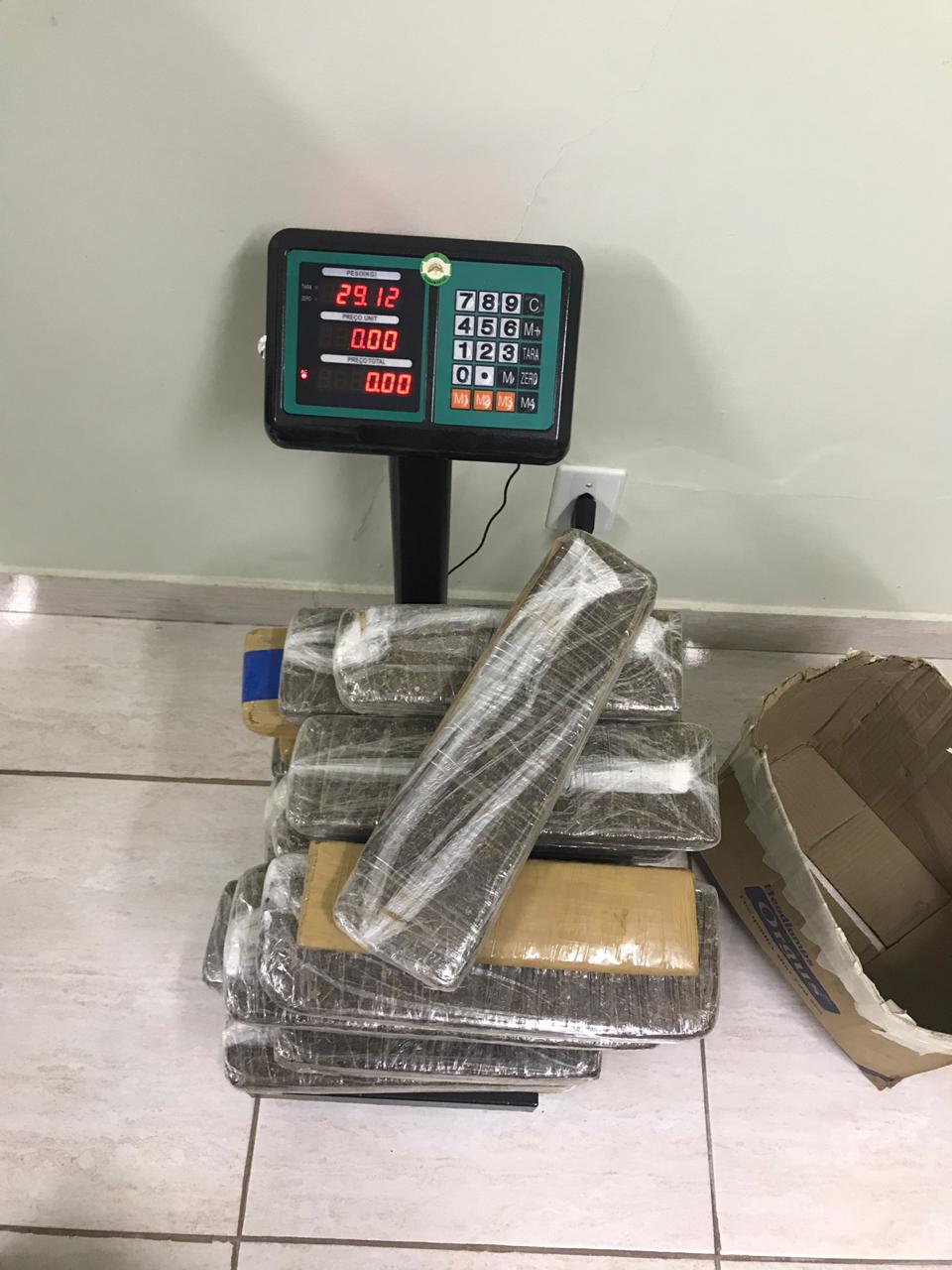Durante a vistoria veicular, foram encontradas duas malas com aproximadamente 33 tabletes de maconha, totalizando pouco mais de 291 quilos.
