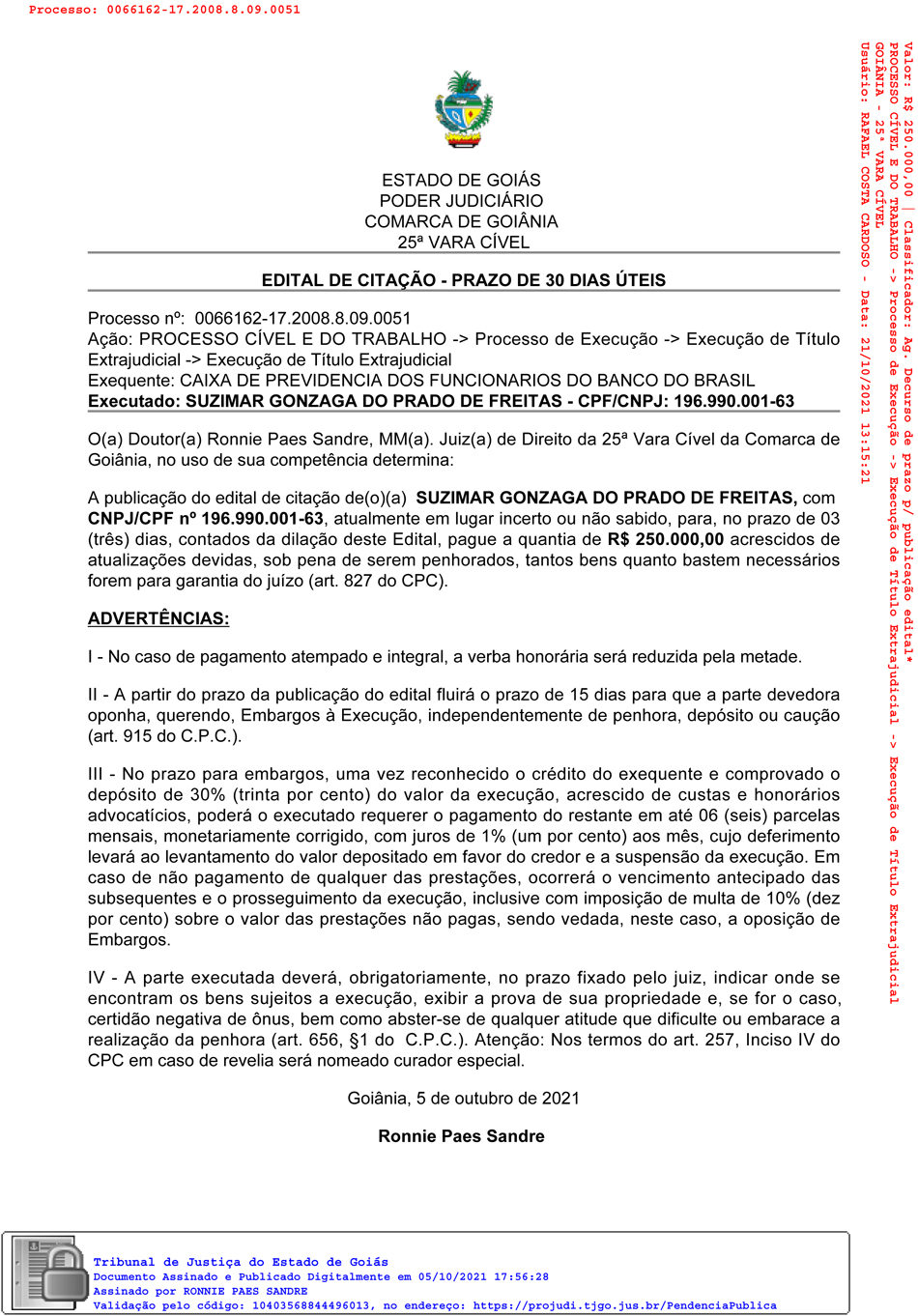 O juiz da 25ª Vara Cível de Goiânia, Ronnie Paes Sandre determina a publicação do edital de Citação de Suzimar Gonzaga do Prado de Freitas para o pagamento de R$ 250 mil a Caixa de Previdência dos Funcionários do Banco do Brasil