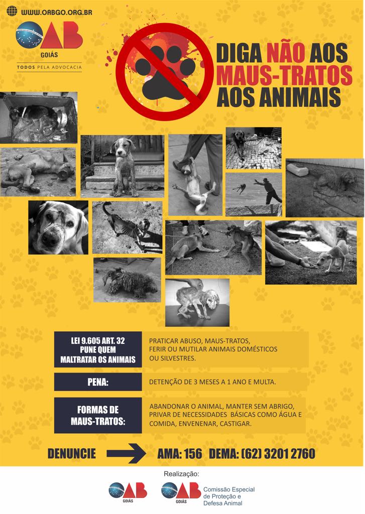 Para promover tais ações, a Comissão Especial de Proteção e Defesa Animal da OAB/GO criou de forma permanente uma campanha digital que explica e orienta a população acerca de maus tratos. Por meio de folders digitais, a campanha dá ênfase a lei 9.605 que pune quem maltrata animais com pena de 3 meses a 1 ano e ainda prevê multa para os infratores.