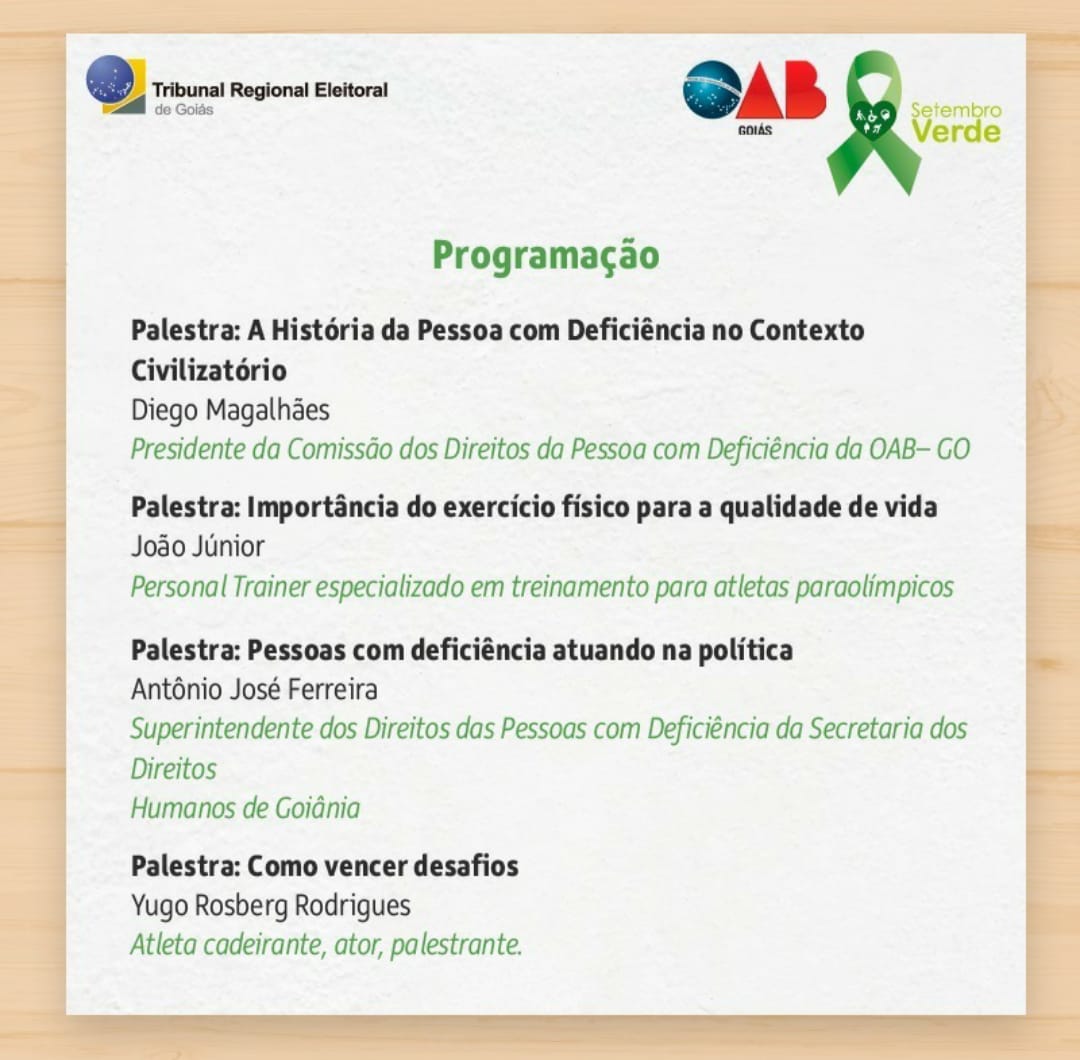 O atleta cadeirante e ator Yugo Rosberg Rodrigues vai abordar o tema “como vencer desafios”. Já a Secretaria de Direitos Humanos de Goiânia participa com uma palestra sobre pessoas com deficiência que atuam na política.