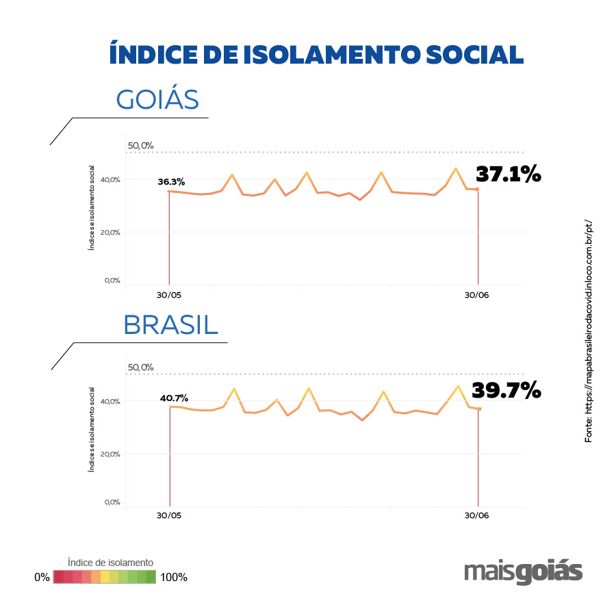 O índice de isolamento social permaneceu estável no mês de junho. O índice registrado no dia 1º foi de 36,3% contra 37,1% no dia 30. Apesar disso, foram registradas oscilações ao longo do mês, com o maior percentual registrado no dia 28 de junho (domingo), com 46,4% e o menor no dia 19 (sexta-feira), com 32,5%. As informações são da empresa de georreferenciamento In Loco.