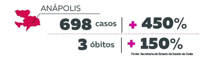 Em Anápolis o número de casos saiu de 155 para 853, o que representa um crescimento de 450%. O percentual é maior do que o registrado no mês de maio (240%). Além disso, 81,82% de todos os casos foram registrados no mês de maio. O número de óbitos na cidade saiu de 2 para 5.