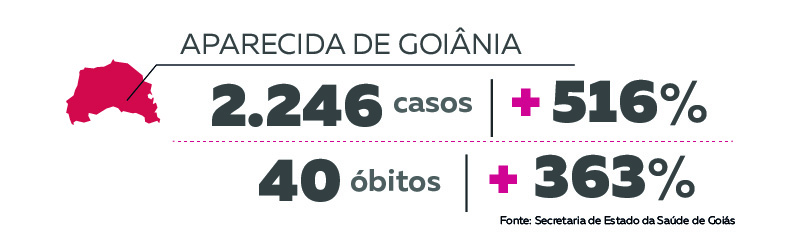 Entre as três maiores cidades do estado, a que apresentou maior aumento foi Aparecida de Goiânia. Lá, o número de casos saltou de 435 para 2.681, o que representa um aumento de 516%. Entretanto, este percentual é menor do que o aferido em maio (640%). Além disso, 83,67% dos casos de Covid-19 na cidade foram confirmados somente no mês de junho.
