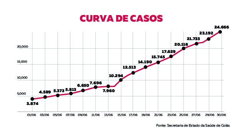 Durante o mês de junho, o número de casos de coronavírus em Goiás aumentou 536%. Os dados divulgados pela Secretaria de Estado da Saúde (SES)* nesta terça-feira (30) mostram que o acumulado chegou a 24.666 confirmações, contra 3.874 registradas no primeiro dia do mês.