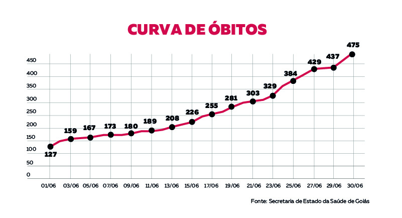 Além disso, o número de mortes saltou de 127, no dia 1º de junho, para 475 nesta terça – um crescimento de 327% no período. Foram 348 vítimas fatais no mês, o que representa 73,26% de todos os óbitos causados pela doença desde o início da pandemia.