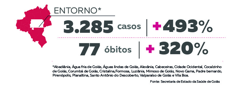 A doença já chegou em todos os 19 municípios da microrregião. A cidade com maior número de casos e óbitos é Águas Lindas de Goiás. Lá, as confirmações saíram de 197 para 722. Já o número de mortes saiu de 5 para 25.