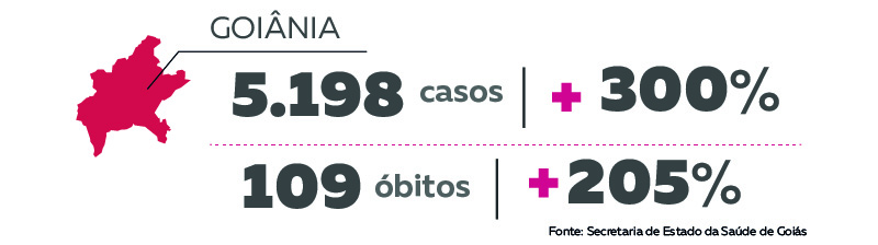 A capital registrou o menor aumento das três maiores cidades no mês. O número de casos saiu de 1.729 para 6.927, um crescimento de 300%. Goiânia continua a ser o epicentro da Covid-19 no estado, concentrando 28,08% dos casos confirmados.