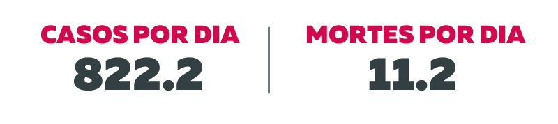 Em média, morreram 11,2 pessoas por dia ao longo do mês. Já a média de casos confirmados por dia é de 822,2.