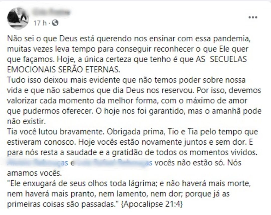 Pelas redes sociais, uma prima do irmão de Heloísa, filho de Maria Helena e Juarez, compartilhou uma mensagem de conforto. Pelo Facebook, a mulher lamenta a perda dos familiares e diz que a tragédia evidencia “que não temos poder sobre nossa vida”.