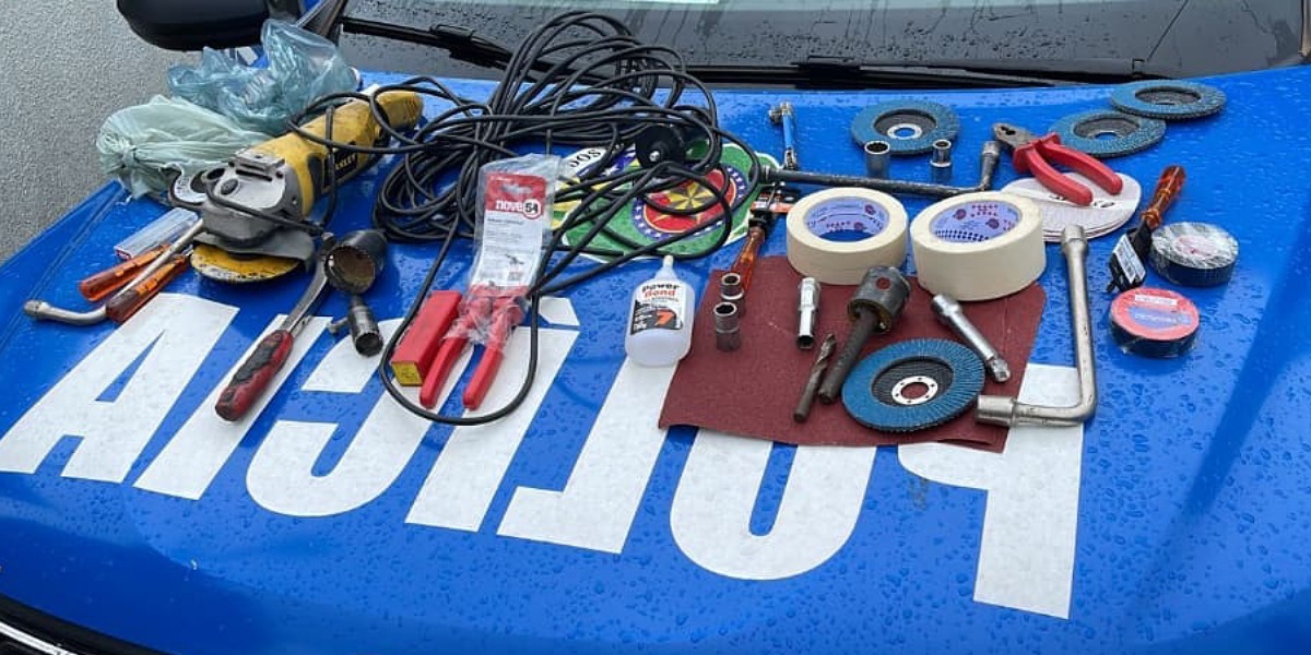 Ao chegar ao local, a Polícia Militar conseguiu flagrar o homem em posse de vários objetos que eram da empresa, como chave de roda, alicate, lixadeira, lixas, cola, alicates, chaves de fenda, entre outros.