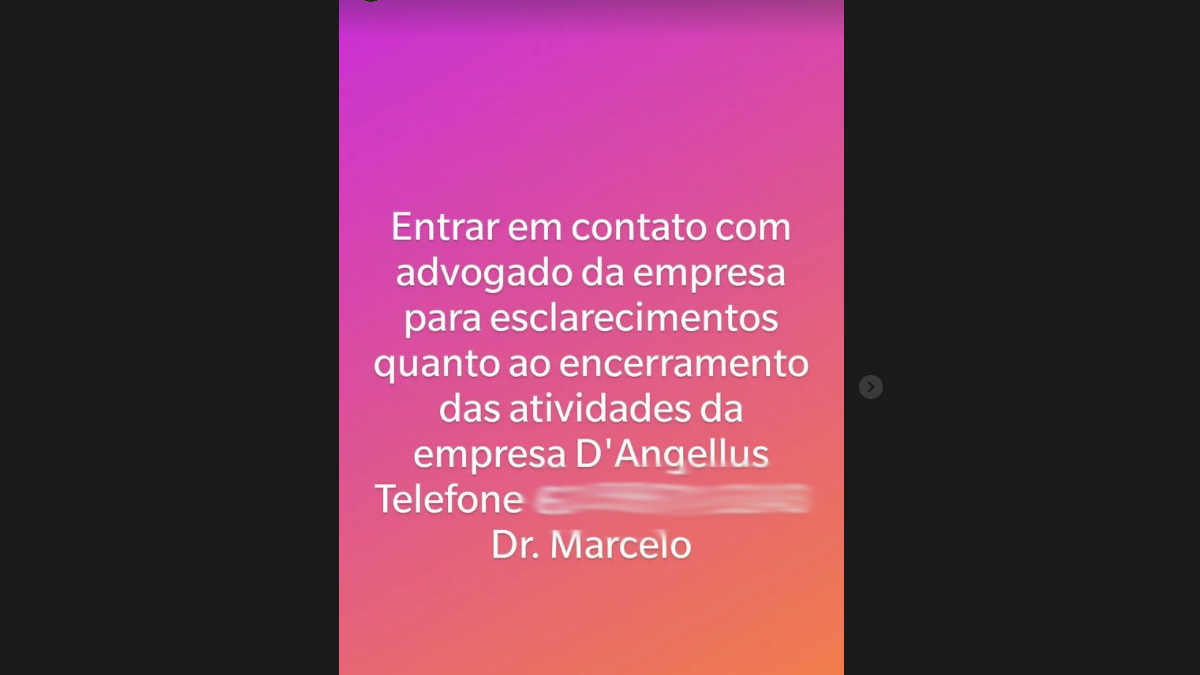 “Entrar em contato com o advogado da empresa para esclarecimentos quanto ao encerramento das atividades da empresa D’Angellus”, informa a mensagem que deixa o contato.