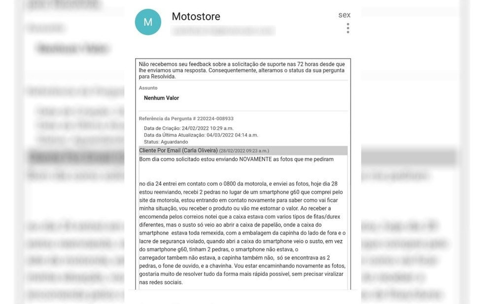 “No dia 24 entrei em contato com o 0800 da Motorola e enviei as fotos. Hoje, dia 28, estou reenviando. Recebi duas pedras no lugar de um Smartphone G60, que comprei pelo site da Motorola. Estou entrando em contato novamente para saber como vai ficar minha situação. Vou receber o produto ou vão me estornar o valor?”, questiona em trecho da reclamação.