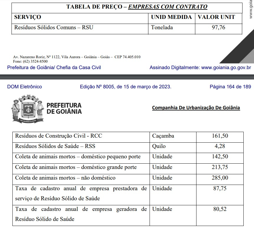 “A Diretoria Executiva da Companhia de Urbanização de Goiânia (Comurg) (…) resolve alterar os valores da Tabela de Preços de serviços de tratamento, destinação e disposição final de resíduos sólidos depositados no Aterro Sanitário de Goiânia, conforme tabelas abaixo: (…) resíduos de construção civil (RCC) – caçamba – R$ 161,50”, diz trecho da publicação.