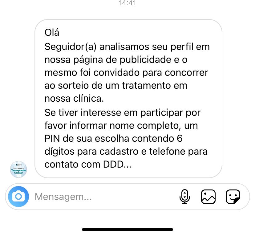 Segundo ele, os golpistas começaram a seguir clientes da página oficial da clínica dele, no Instagram, com um perfil falso e, então, começaram e enviar mensagens via direct.