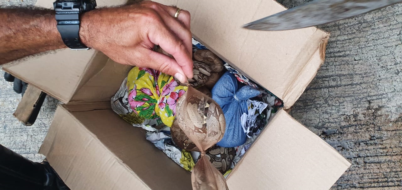 A encomenda havia chegado por volta das 9 horas da manhã, mas até a noite ninguém foi ao local para buscá-la. Os funcionários de uma empresa de ônibus sentiram um forte odor e resolveram abrir o recipiente. Lá, encontraram 14 jiboias e uma cobra verde. Junto estava um saco com 30 sapos, todos mortos. Os anfíbios provavelmente serviriam para alimentação dos répteis.