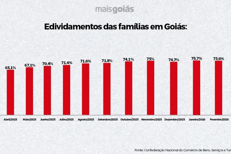 Quase 76% das famílias em Goiás estão endividadas, segundo levantamento mais recente da Confederação Nacional do Comércio de Bens, Serviços e Turismo (CNC). O índice chegou a 75,8% em março deste ano, um aumento de mais de dez pontos percentuais em relação ao mesmo período de 2025, quando era de 64,2%. O avanço acompanha a tendência nacional, que atingiu 80,4%, o maior patamar já registrado pela Pesquisa de Endividamento e Inadimplência do Consumidor (Peic).