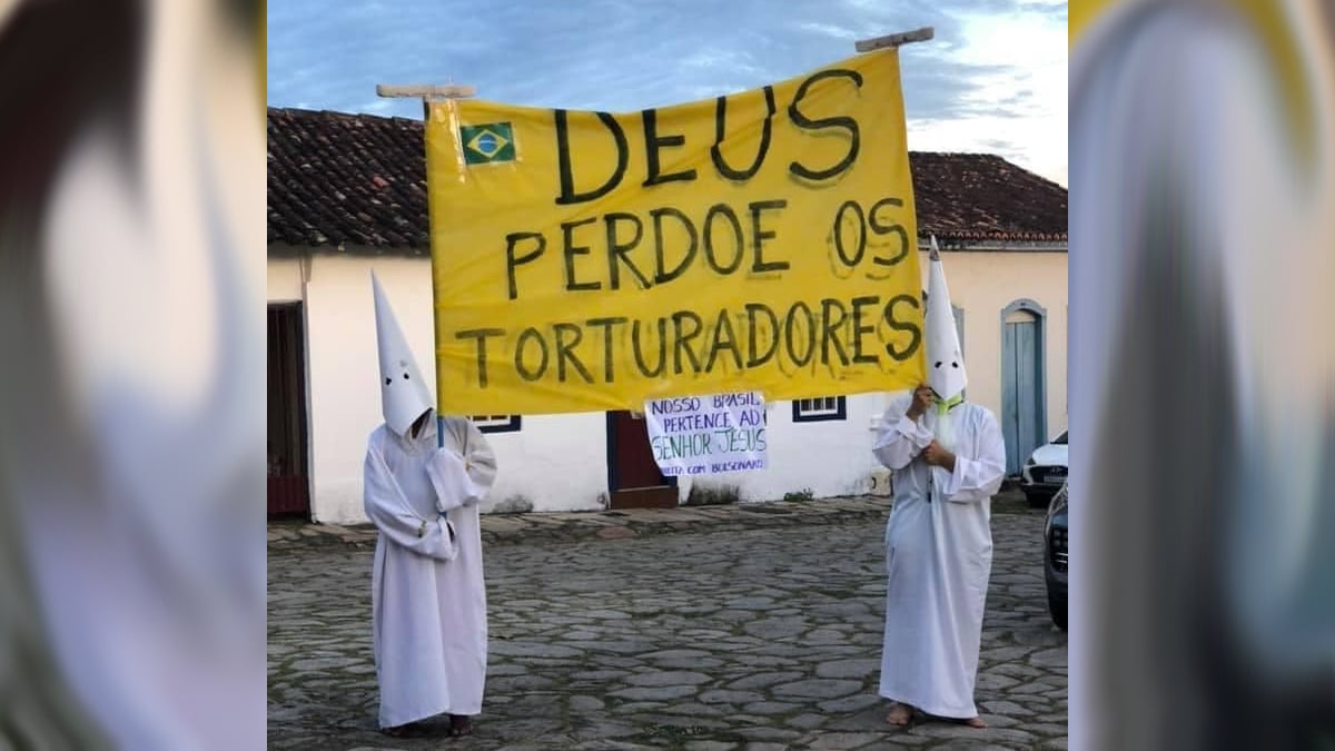 Na tarde de ontem, como é de amplo conhecimento, fomos surpreendidos com a distribuição de algumas fotografias nas redes sociais, das quais continham duas pessoas com vestimentas brancas, capuz com dois furos sobre a cabeça e que portavam uma espécie de cartaz/faixa com a descrição “Deus perdoe os torturadores” e logo abaixo “Nosso Brasil pertence ao Senhor Jesus” e “Direita com Bolsonaro”.