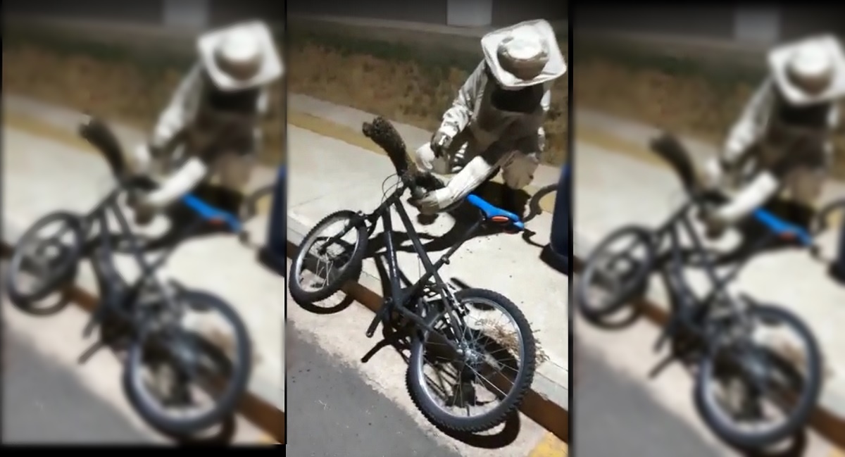 As abelhas nômades se alojaram no guidão da bicicleta e crianças brincavam no local do ocorrido