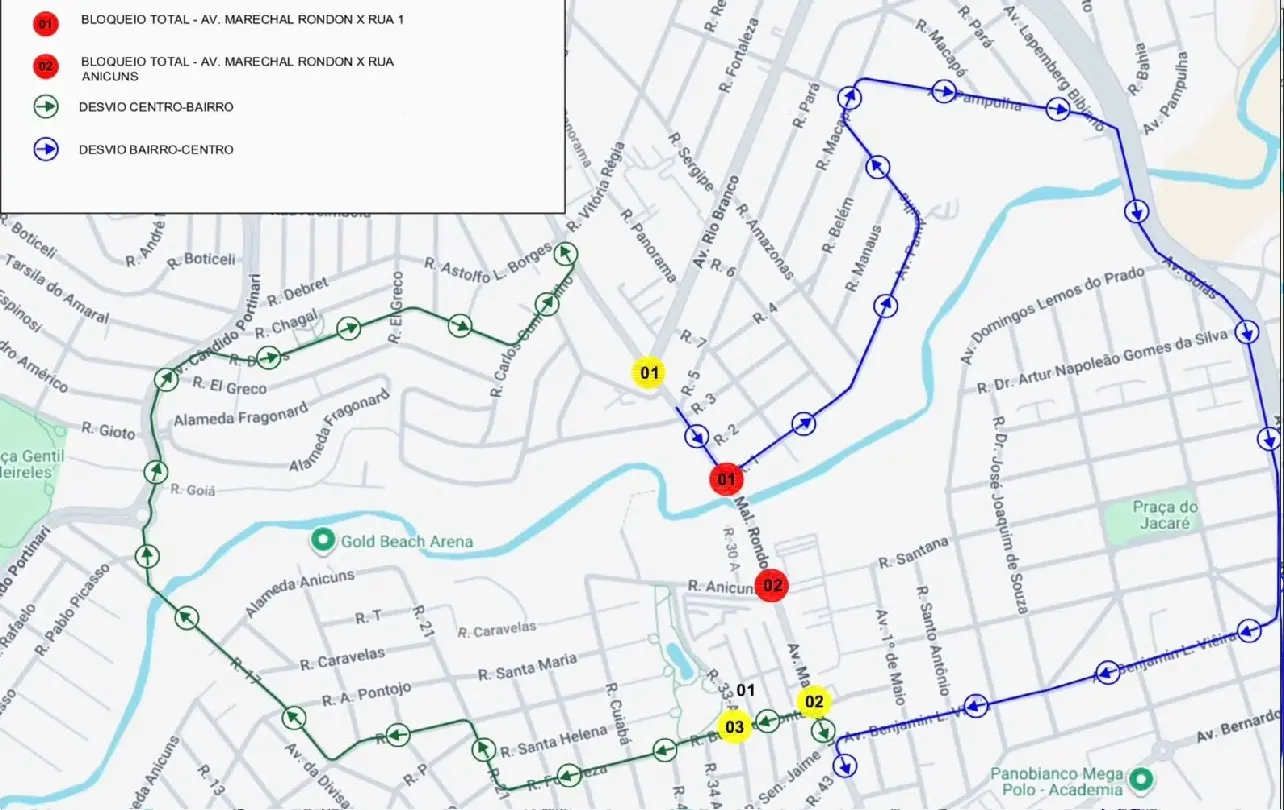 Para orientar quem transita pela região, a SET definiu rotas alternativas nos dois sentidos da via. No sentido Centro–Bairro, o desvio indicado é pela Rua Belo Horizonte, seguindo pela Rua 21, Rua 0 (Zero), Rua 17, Av. Cândido Portinari, Rua Degas e retornando à Marechal Rondon pela Rua Carlos Cunha Filho. Já no sentido Bairro–Centro, os motoristas devem acessar a Rua 1, e após a Avenida Pampulha, seguindo o novo desvio definido pelas equipes técnicas da pasta.