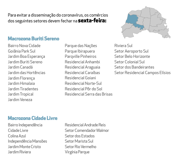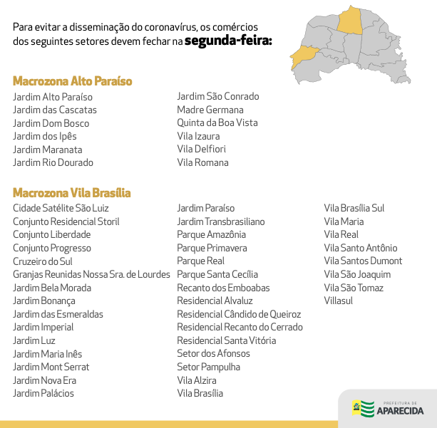 No primeiro e segundo cenários (verde e amarelo): fecha, na segunda-feira, o comércio da Vila Brasília e Paraíso; na terça-feira, Garavelo e Zona da Mata; na quarta-feira, Buriti Sereno e Cidade Livre; na quinta-feira, Centro e Expansul; e na sexta-feira, Santa Luzia e Papillon. No domingo, todas atividades são suspensas, exceto de serviços de saúde de urgência.