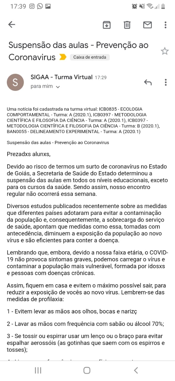 Além disso, foi encaminhando a alunos da UFG, um e-mail informando que, “devido ao risco de termos um surto de coronavírus (…), nosso encontro regular não ocorrerá essa semana”. O Mais Goiás teve acesso ao print do correio eletrônico: