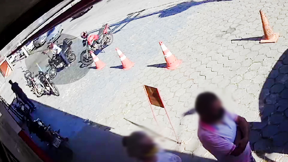 Uma câmera de segurança flagrou o condutor da moto chegando ao local de trabalho do rapaz de 18 anos e o ameaçando. A gravação é de quarta, por volta das 9h. Ele pediu para não ser identificado por medo.