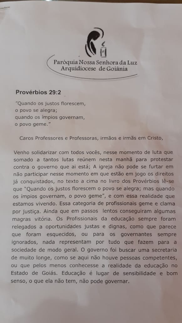 Um dos apoiadores do movimento pela Educação é o padre José Barbosa, da Paróquia Nossa Senhora da Luz. Em uma carta, o religioso usa discurso bíblico para justificar seu posicionamento. Segundo ele, “[A igreja] não pode se furtar à participação nesse momento em que estão em jogo os direitos já conquistados. O líder religioso ainda cita o livro dos Provérbios: “quando os justos florescem, o povo se alegra; mas quando os ímpios governam, o povo geme”.