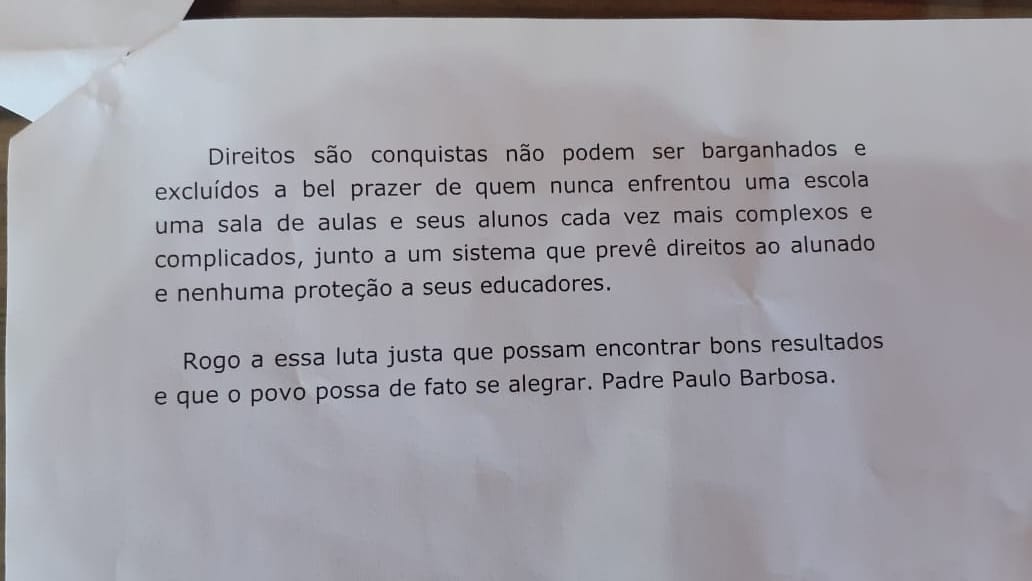 A carta continua dizendo que os professores clamam por justiça e que conseguiram alguns poucos direitos em passos lentos. “O governo foi buscar uma secretária de muito longe, como se aqui no houve (sic) pessoas competentes”, diz o escrito. “Educação é lugar de sensibilidade e bom senso, o que ela não tem, não pode governar”, escreve ainda.