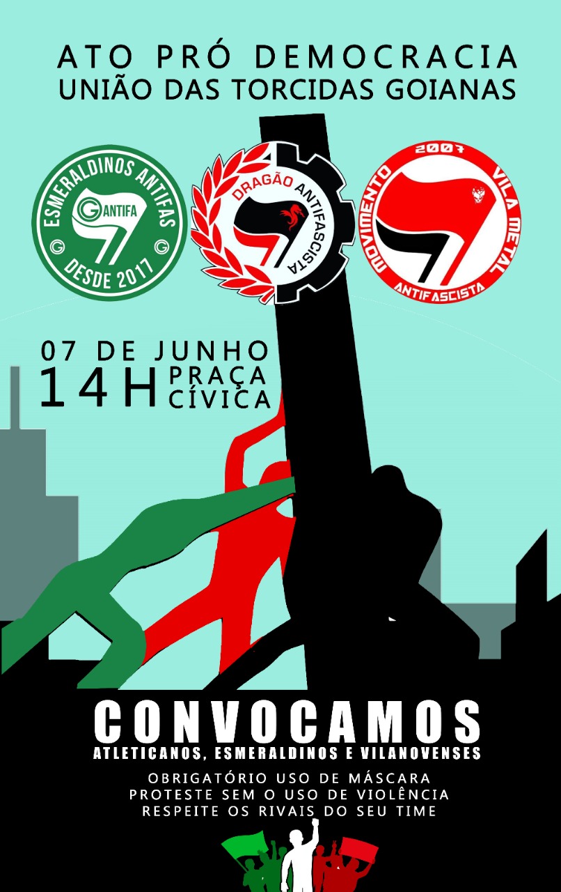 Inclusive, existe, também, uma convocação unificada das torcidas dos três maiores clubes de Goiânia: Vila Metal (Vila Nova), Dragão Antifascista (Dragão) e Esmeraldinos Antifas (Goiás). Para Igor Dias, presidente da Vila Metal, quem não é fascista não vai se ofender com o ato, que é antifascista.