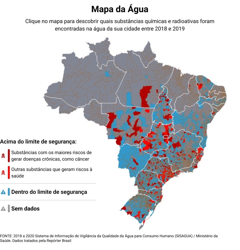 Um levantamento feito pelo site Repórter Brasil com dados de empresas de abastecimento de água mostra que, entre 2018 e 2020, laudos apontaram a presença de substâncias químicas ou radioativas, impróprias para consumo, na água em 59 municípios de Goiás. Na soma de todos os estados brasileiros, são 763 cidades. Os laudos usados no estudo foram todos enviados ao Sistema de Informação de Vigilância da Qualidade da Água para Consumo Humano (Siságua), do Ministério da Saúde.