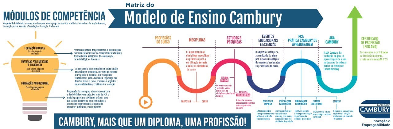 Os alunos de todos os cursos têm um certificado de profissão por ano. E, no final da graduação, o diploma. Ao todo, a Faculdade Cambury – cuja avaliação no Ministério da Educação (MEC) é Nota 4 – oferece 15 cursos presenciais e seis à distância. Apenas 17,9% das faculdades particulares do Brasil tiveram este conceito no último ano.
