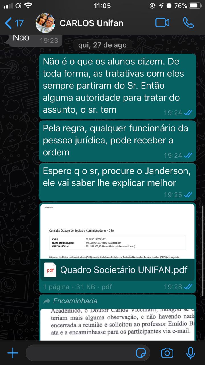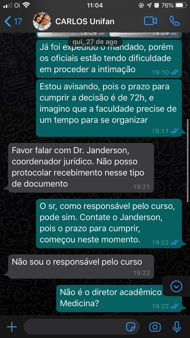 ”Essa intimação que eu tentei falar com ele foi informando a faculdade a primeira vez da decisão judicial que tinha deferido o direito dos alunos. Os alunos me passaram o contato dele e ele negou que era o diretor acadêmico. Mas eu provei que na ata de uma reunião [com os alunos] ele assina como diretor acadêmico”, revela Mariana.