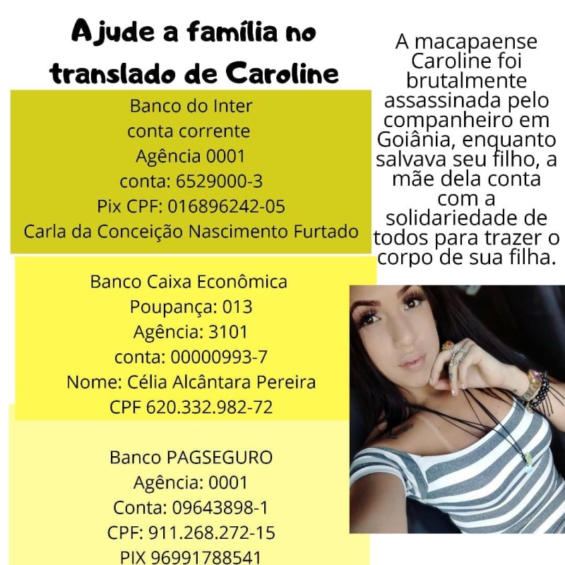 A família de Caroline Conceição do Nascimento, de 26 anos, natural do Macapá, capital do Amapá, criou uma vaquinha virtual para arrecadar o dinheiro necessário para levar o corpo da jovem de volta ao seu estado, onde seus parentes moram. Caroline foi assassinada na frente do filho de 6 anos em Goiânia, no primeiro dia do ano. O suspeito, Anderson Gomes Pedro Pupim, de 40 anos, é guarda civil metropolitano (GCM) e marido da vítima. Ele confessou o crime.