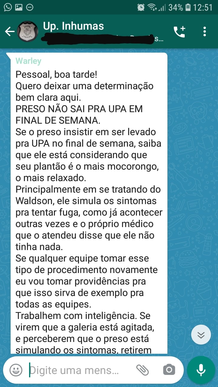 “Preso não sai para UPA em final de semana. Se o preso insistir saiba que ele está considerando que o seu plantão é o mais mocorongo e relaxado. Se qualquer equipe tomar esse tipo de procedimento novamente, eu vou tomar providências para que isso sirva de exemplo pra todas as equipes. Se perceberem que o preso está simulando os sintomas retirem o preso e o deixem algemado pelos pés e mãos dentro do banheiro por um tempo e depois o retornem para a cela”, teria escrito o diretor, em um grupo do qual fazem parte, além dos policiais penais e VPTs, também um enfermeiro, que trabalha no plantão dos finais de semana.